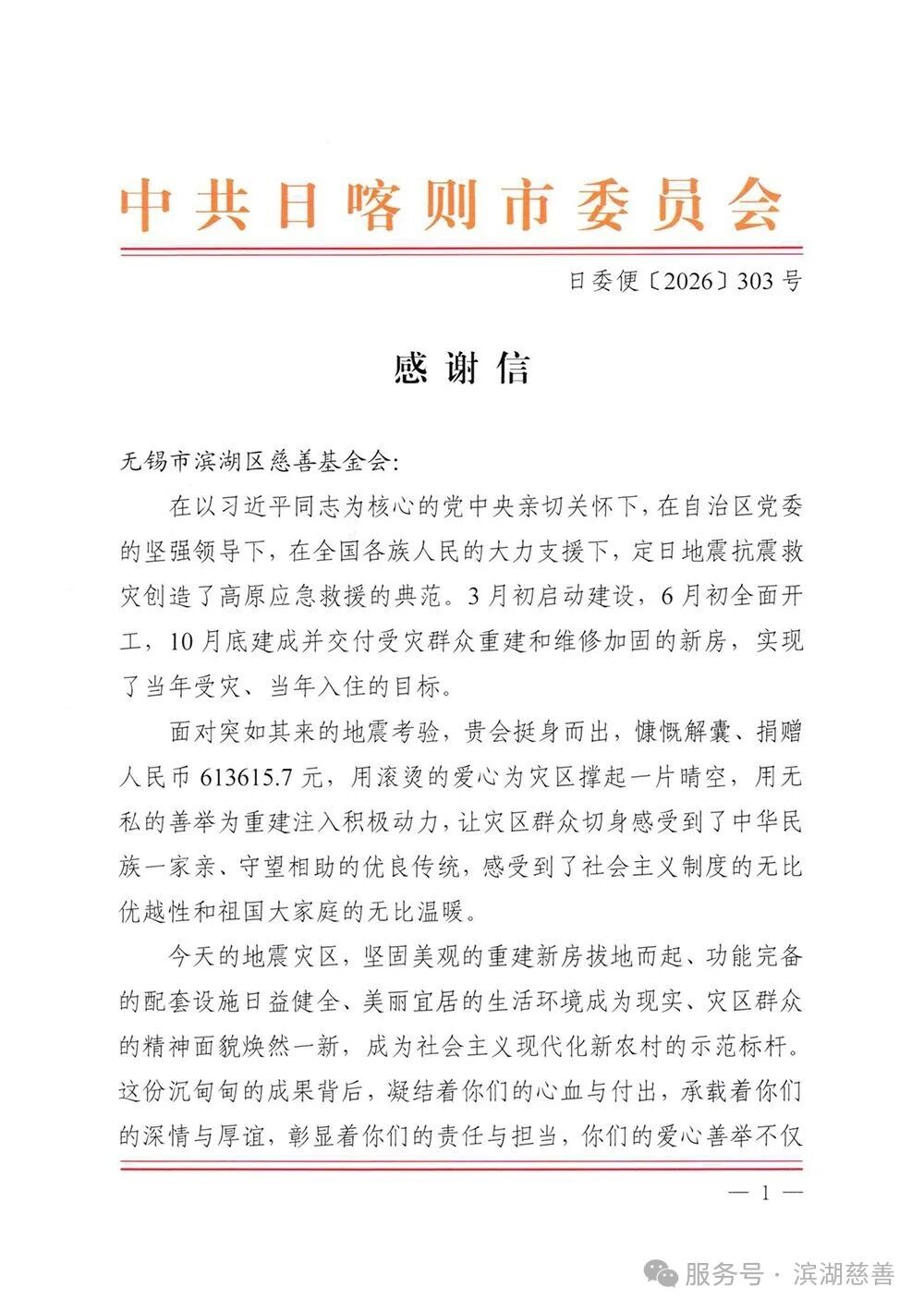 春暖花开时节,日前,西藏日喀则市委、市政府专程致信无锡市滨湖区慈善基金会,对滨湖区在日喀则定日地震抗震救灾中迅速响应、慷慨驰援、全力支援灾区重建的爱心善举,致以最诚挚的感谢与最崇高的敬意。一纸感谢信跨越四千里,承载着高原人民的深情厚谊,见证着苏藏两地守望相助的深厚情谊。
